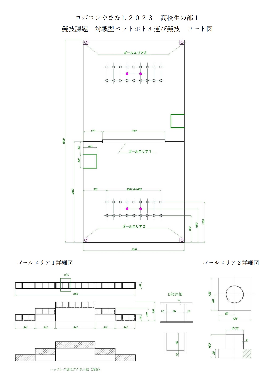 - 相手の得点となるコートとの境界ゴールについては相手のペットボトルを出す行為や故意に相手のロボットを壊す行為は禁止されます。